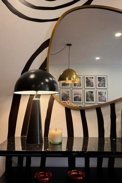 El papel tapiz, diseñado a medida por Adrian Gómez para este proyecto, es una obra de arte en sí misma, inspirada en los patrones y símbolos de las antiguas civilizaciones mexicanas. Esta pieza única es un testimonio del compromiso con la autenticidad y la creatividad, elevando el espacio a un nuevo nivel de sofisticación.