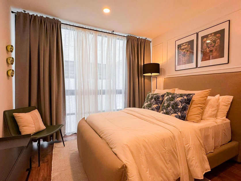 La habitación secundaria se destaca por su estilo ecléctico, en el que se fusionan molduras clásicas con mobiliario contemporáneo. El color verde se utiliza de manera sutil pero efectiva en los cojines decorativos, añadiendo frescura y armonía al ambiente. Además, las ilustraciones que adornan las paredes, creadas por Adrian Gómez, representan máscaras mayas, integrando un toque cultural y artístico único al espacio. Este enfoque complementa la paleta neutra general, mientras que los elementos contemporáneos se equilibran con los detalles clásicos, creando un entorno sofisticado y lleno de personalidad.