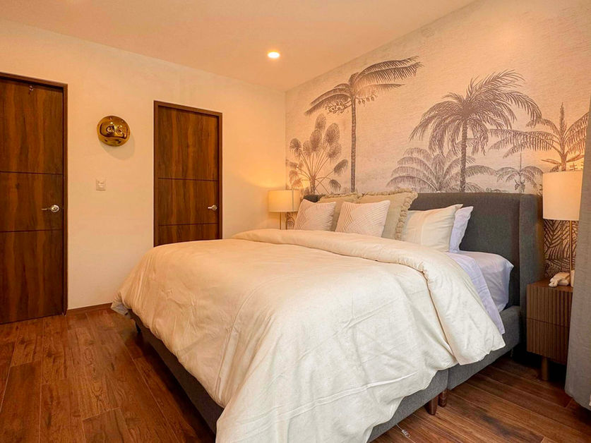 La habitación principal destaca por su atmósfera acogedora y natural. Se utilizaron textiles naturales en tonos suaves, que aportan calidez y confort al espacio. El papel tapiz, inspirado en la selva maya, se convierte en un punto focal, añadiendo una conexión sutil con la naturaleza a través de sus motivos botánicos, mientras mantiene un estilo sofisticado. Para complementar el ambiente, se incluyó una escultura de vidrio soplado en color dorado, de forma orgánica, que refleja la luz de manera elegante, creando un balance perfecto entre lo natural y lo artístico en este espacio.